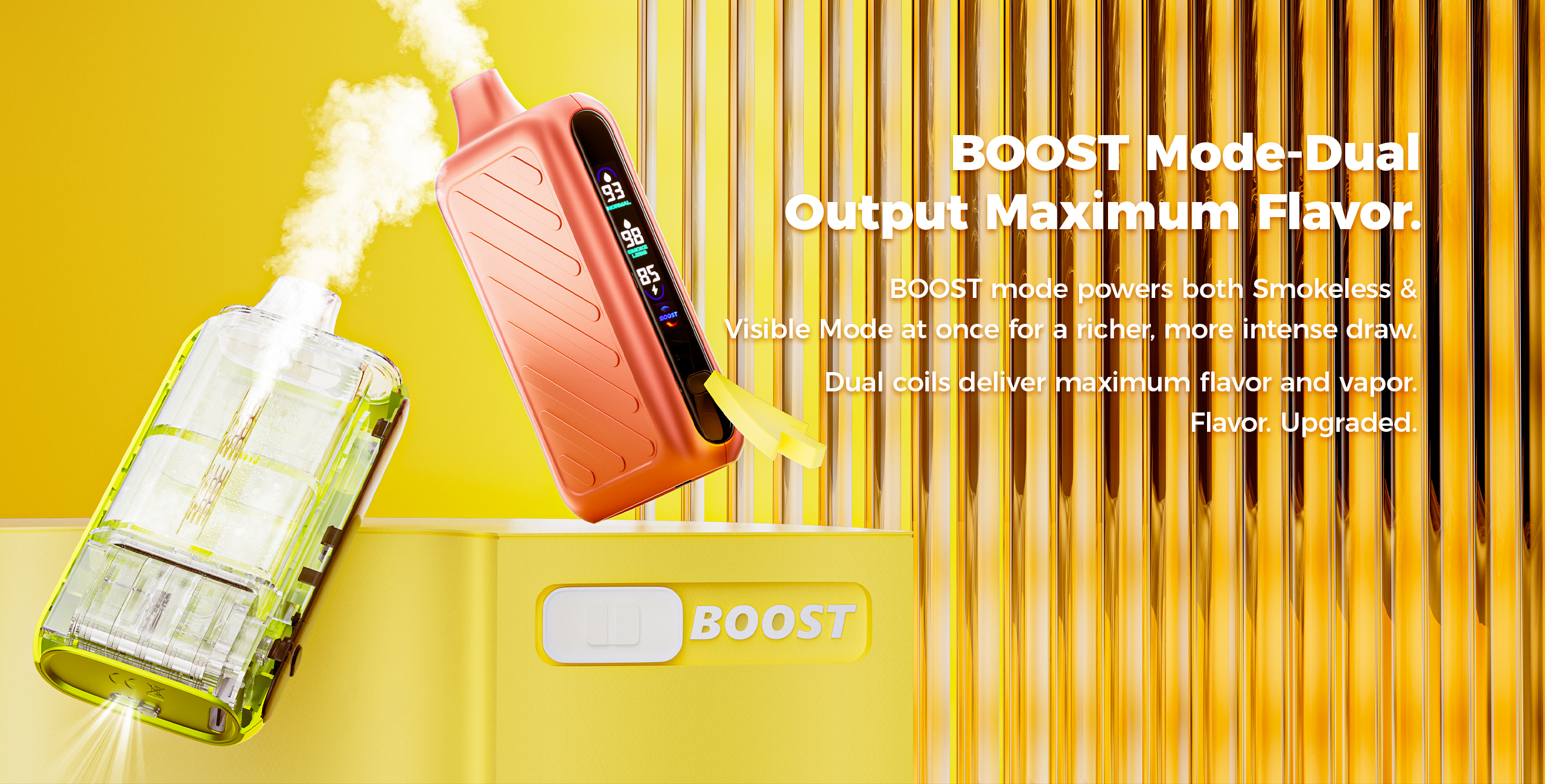 • Tryb Boost – Podwójna Moc – obsługuje jednocześnie tryb Bezdymny i Widoczny dla maksymalnej ilości chmury i smaku.