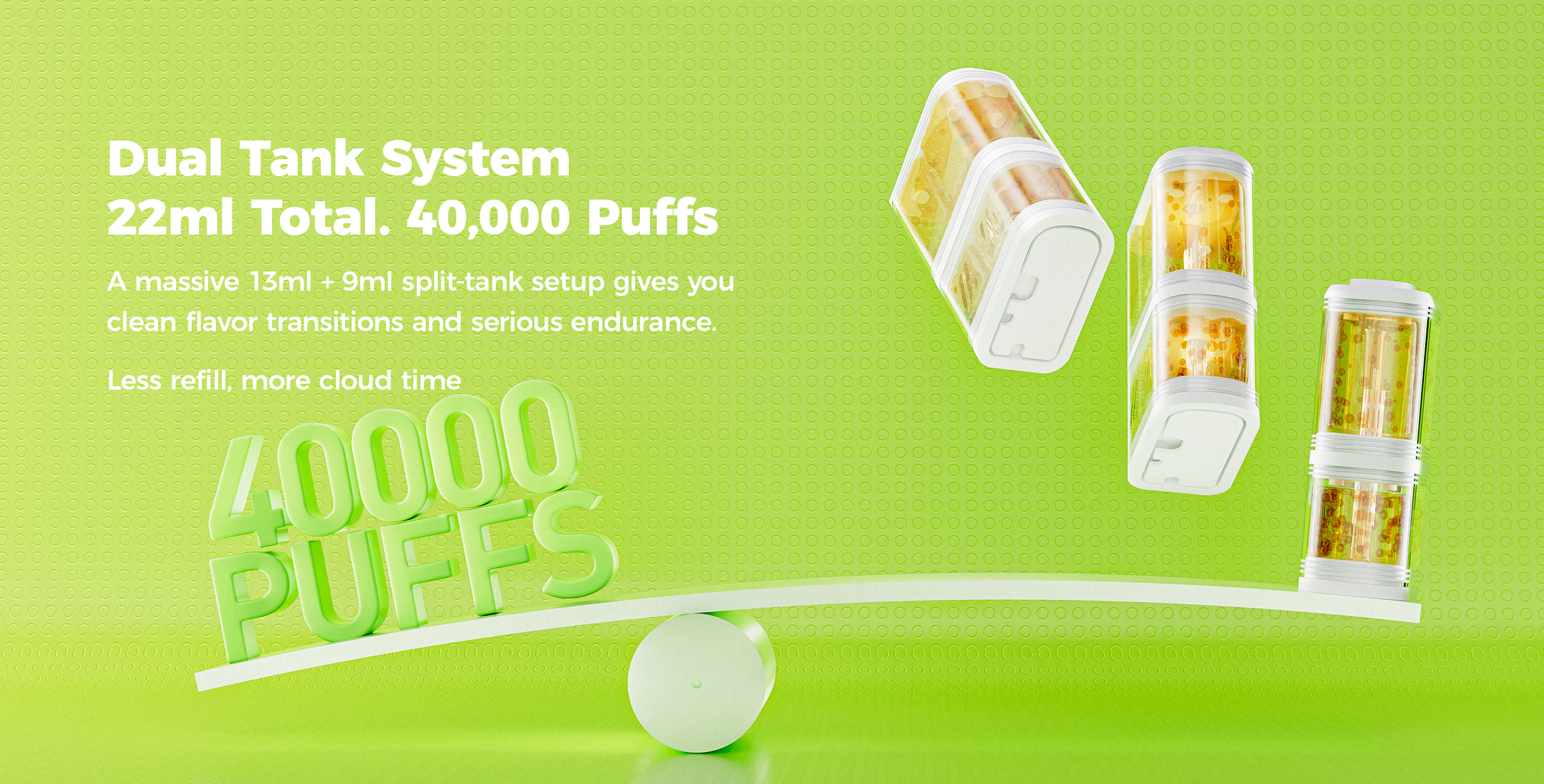 • Podwójny zbiornik (22 ml łącznie) – układ 13 ml + 9 ml pozwala na lepsze rozdzielenie smaków i dłuższą wydajność.